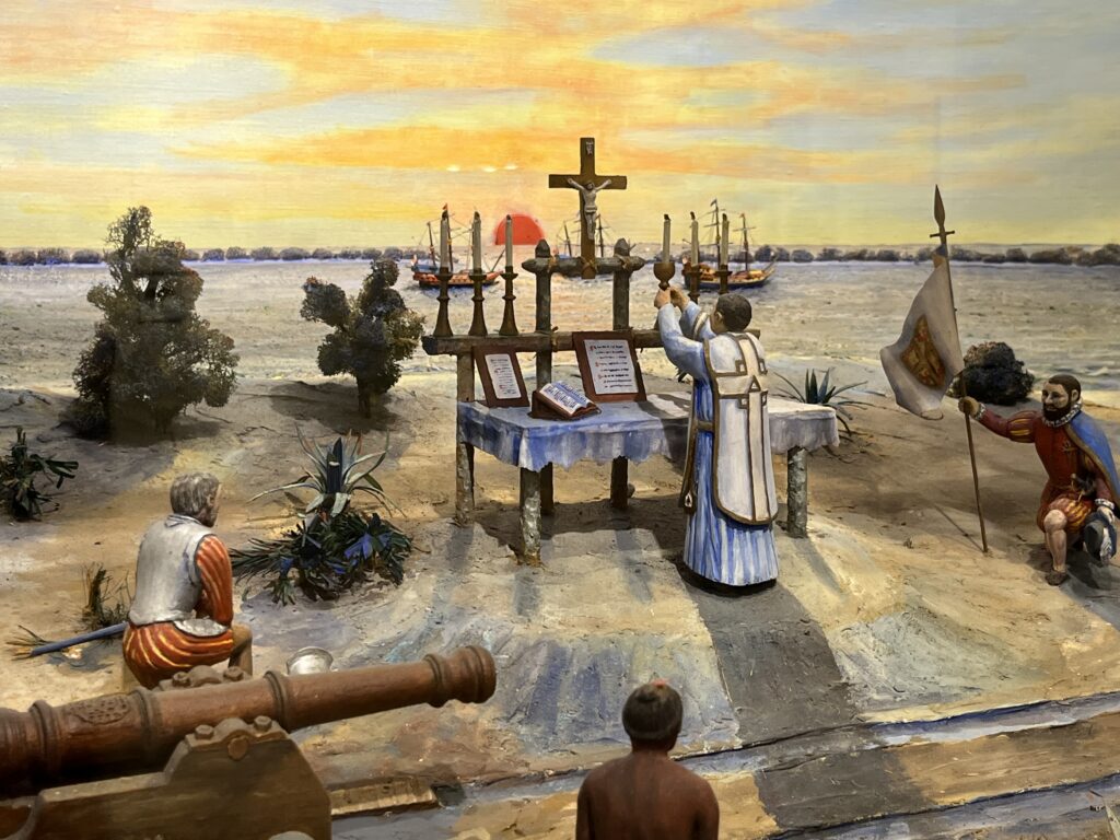 In his journal, Father Francisco Lopez de Mendoza Grajales, the chaplain for the Spanish, recounted this day of thanksgiving, “[o]n Saturday, the 8th, the general landed with many banners spread, to the sound of trumpets and salutes of artillery. As I had gone ashore the evening before, I took a cross and went to meet him, singing the hymn Te Deum laudamus. The general marched up to the cross, followed by all who accompanied him, and there they kneeled and embraced the cross.”