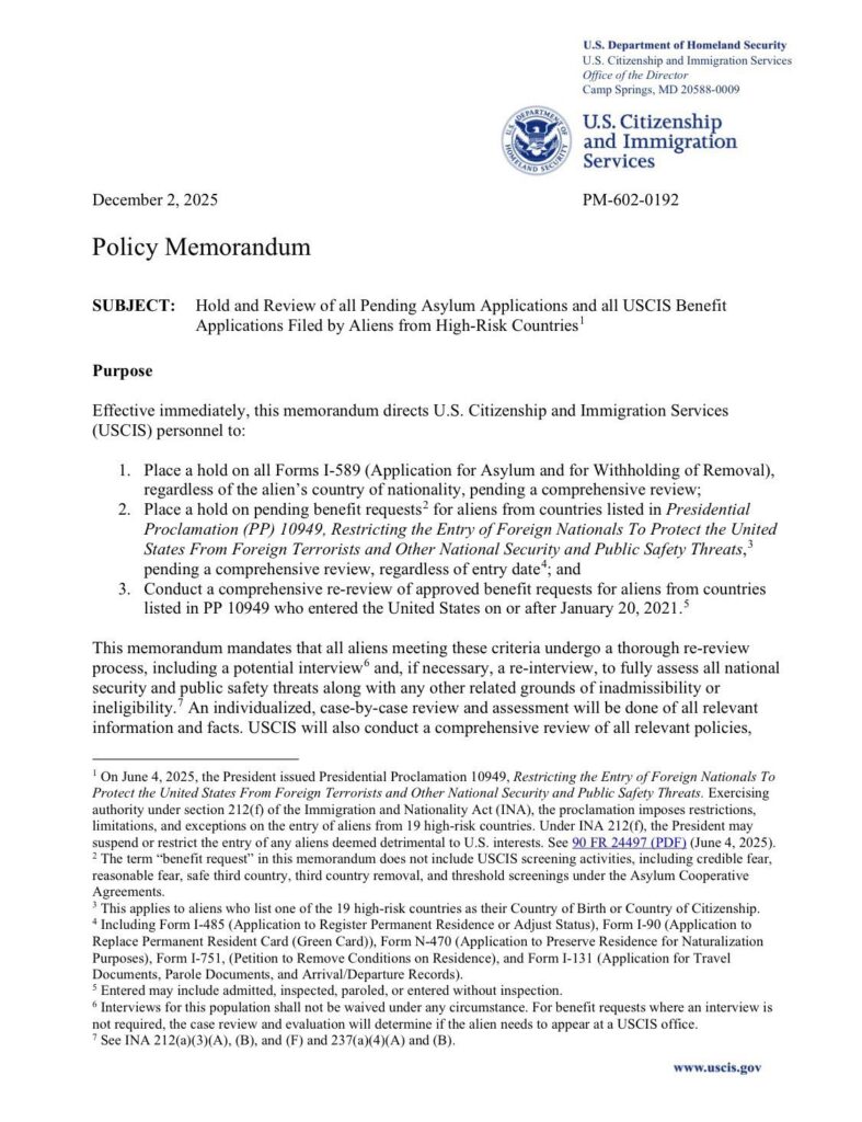 Immigration officers were ordered to postpone approvals, denials, and interviews until further guidance is instructed.