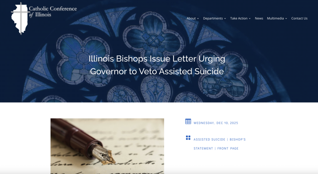 In October, the Catholic Conference of Illinois released a statement condemning the bill, saying “the Illinois General Assembly has put our state on a slippery path that jeopardizes the well-being of the poor and marginalized” and asked Governor Pritzker to “not only to veto this bill in totality, but also to address humanely the reasons why some view assisted suicide as their only option” and “expand and improve on palliative care programs that offer expert assessment and management of pain and other symptoms.”