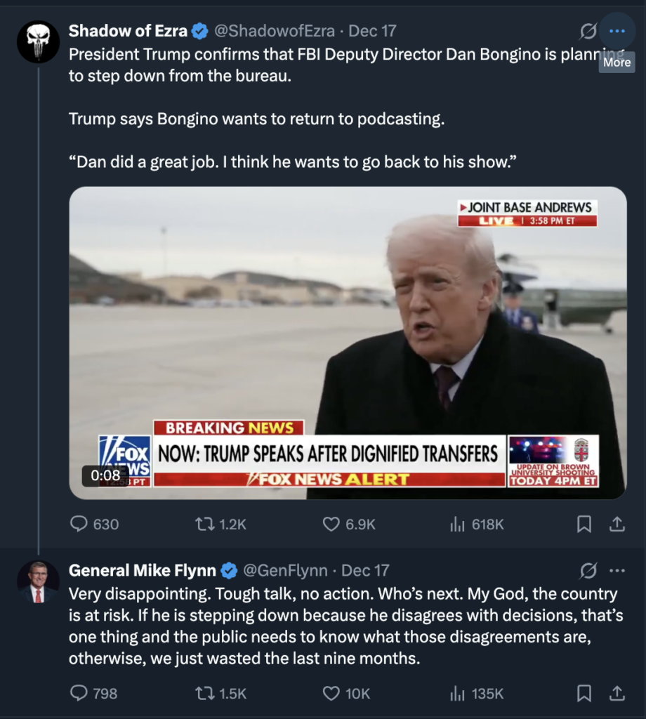 FBI Deputy Director Dan Bongino announced via X that he is leaving his position with the agency in January and thanked President Trump, Attorney General Pam Bondi, and FBI Director Kash Patel “for the opportunity to serve with purpose.” Bongino, a devout Catholic and former US Secret Service Agent, was the host of a very popular conservative podcast before being tapped for his FBI role.
