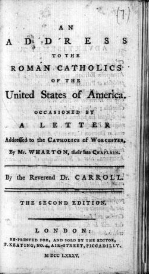 France’s papal nuncio asked Benjamin Franklin for his suggestion for this position, Franklin recommended Father Carroll. The Holy Father picked Father Carroll as the Superior of the Missions in the United States. In 1784, Father Carroll published, “An Address to the Roman Catholics of the United States of North America,” the first Catholic work published in the United States. Even in a country with predominately anti-Catholic views, Father Carroll appealed to the Catholics that he was now shepherding, “[g]eneral and equal toleration, by giving a free circulation to fair argument, is a most effectual method to bring all denominations of Christians to an unity of faith.”