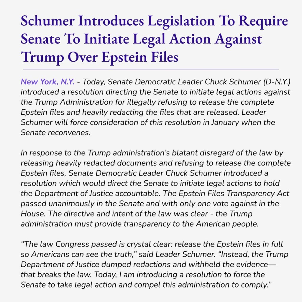 Senate Minority Leader Chuck Schumer intends to force a vote on a measure to permit the chamber to jump-start litigation against the Trump administration for failing to act in accordance with the new law, insisting on the full release of the Jeffrey Epstein files.