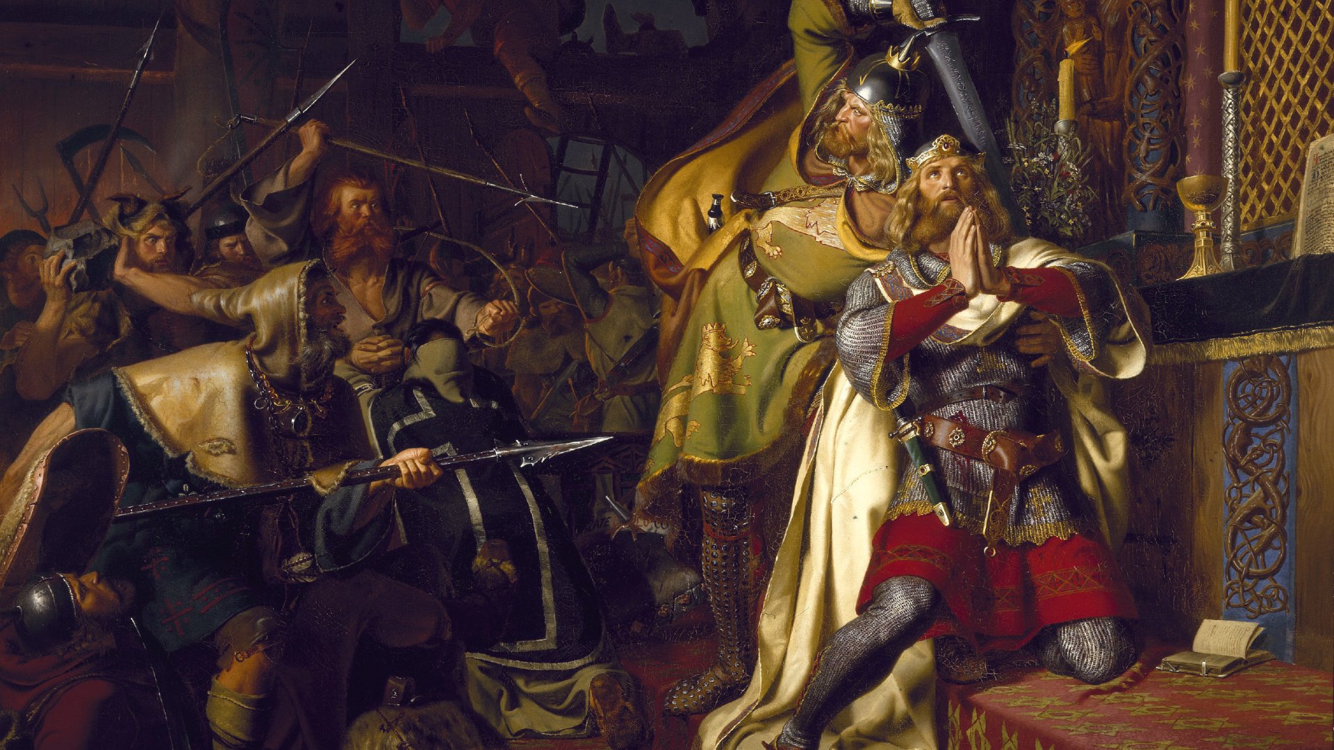 Canute’s plan, however, had to be abandoned suddenly, for those aristocrats who opposed his tax policy revolted as he was preparing to embark for England. He fled from the rebels, led by his brother Prince Olaf, to St. Alban’s Church, Odense, which he had founded, and was assassinated there with the entire royal party.