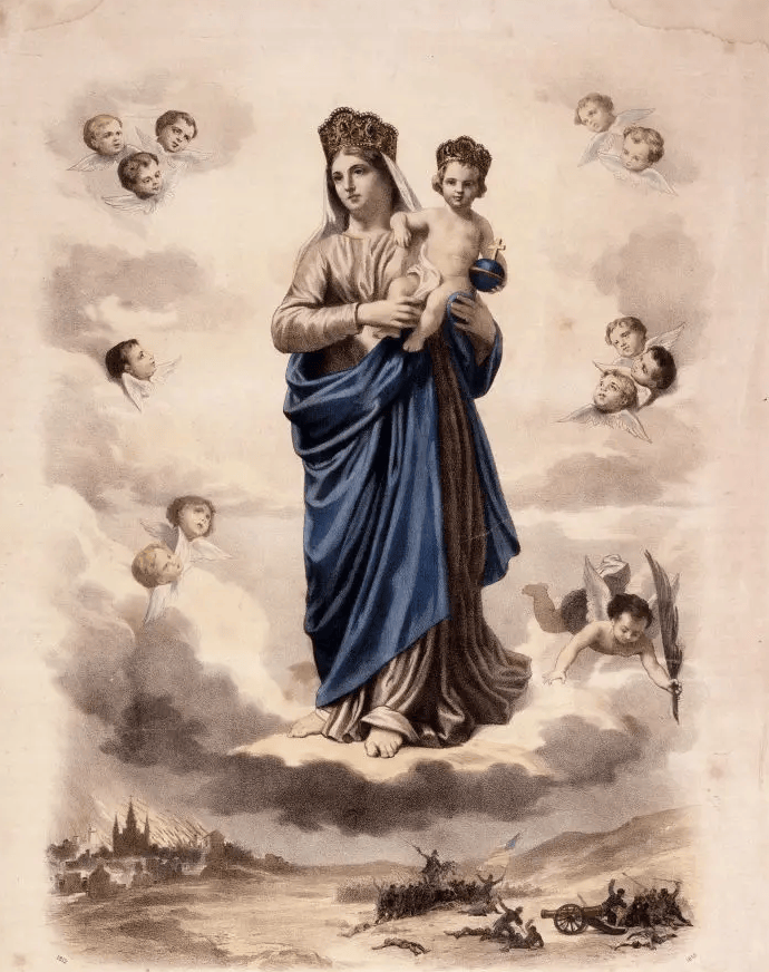 Devotion to Mary under this title grew and was intensified by two events, a fire and a battle. In 1812, a fire spread through New Orleans. It was heading towards the convent when Sr. Anthony put a statue of Our Lady of Prompt Succor, so that the Blessed Mother faced the fire. Mother St. Michel called for her, “Our Lady of Prompt Succor, we are lost, unless you hasten to our help.” Immediately after this prayer, the wind shifted, and the flames died down. Those praying in the convent exclaimed in thanksgiving, “Our Lady of Prompt Succor has saved us!”.