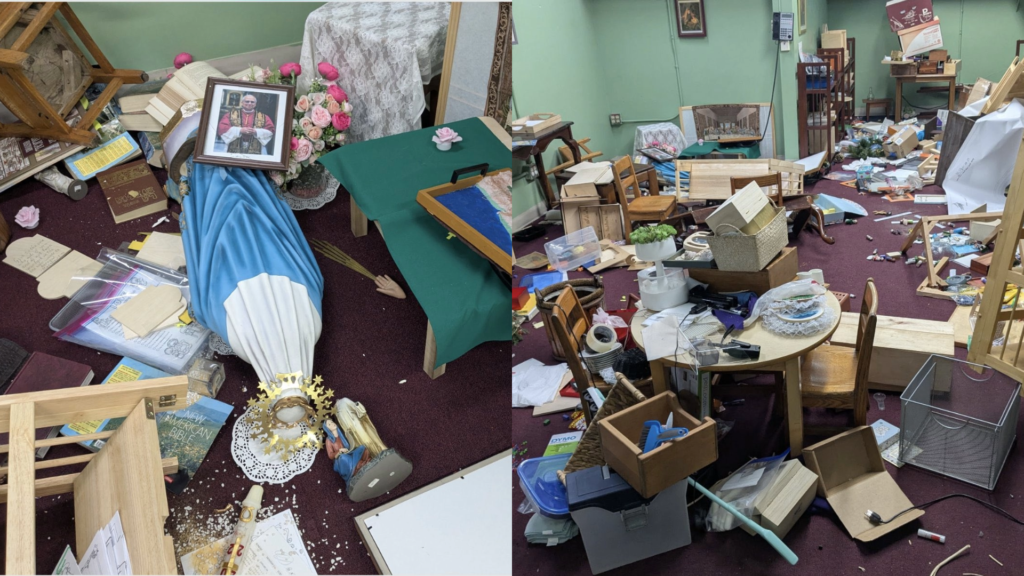 The Catholic men’s group Sanctus Fidelis reports that Bishop Mark Trudeau “said that it is the worst case of vandalism that he’s ever seen in the region.” Thankfully, the group was able to confirm that while some of the consecrated hosts were damaged by the tabernacle being thrown to the ground, none were stolen.