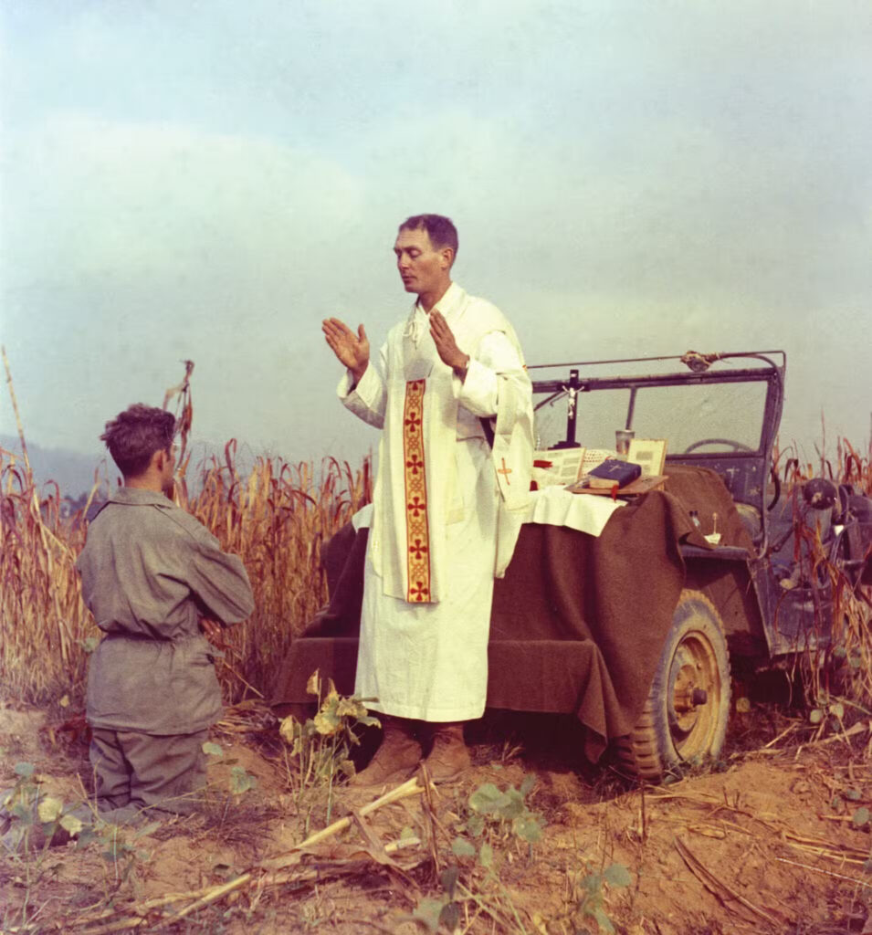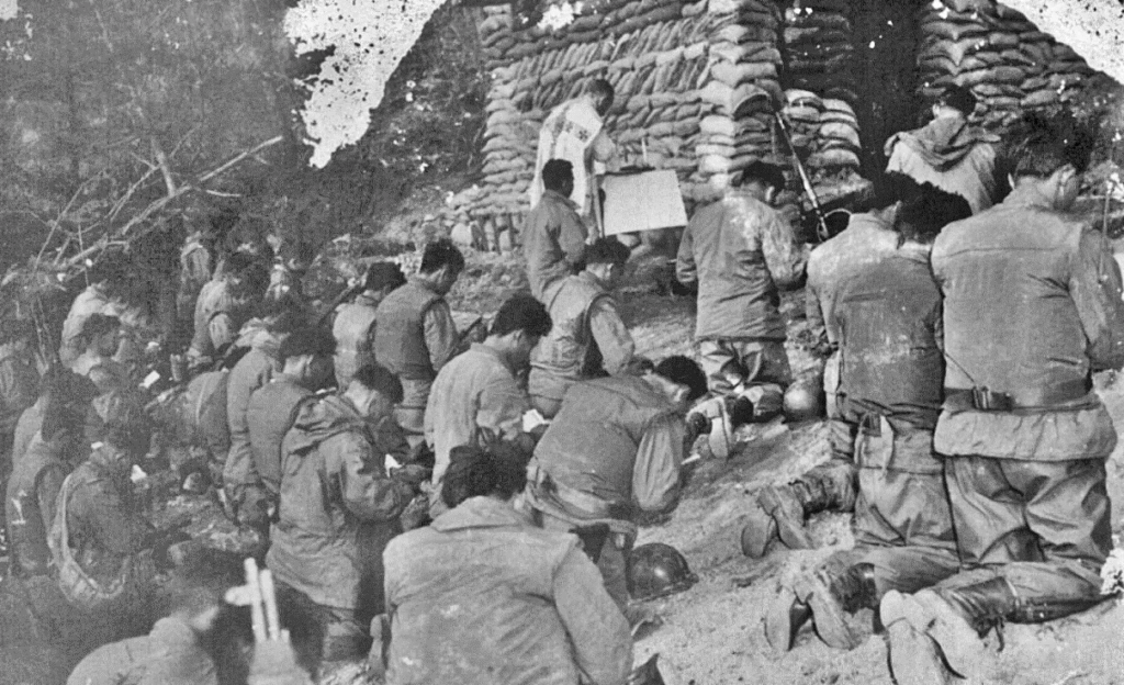 On July 11, 1950, Chaplain Kapaun’s unit set out to help South Korea. He wrote to his bishop, “[t]omorrow we are going into combat. I have everything in order, all Mass stipends, my will, etc. The way the Catholic soldiers are rallying around the priest is edifying.”