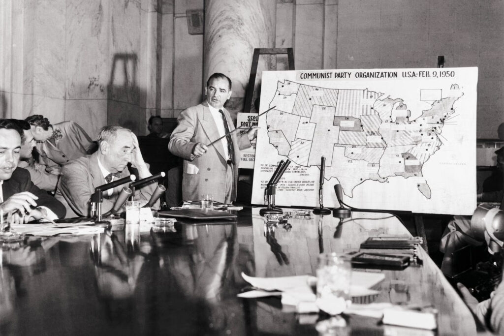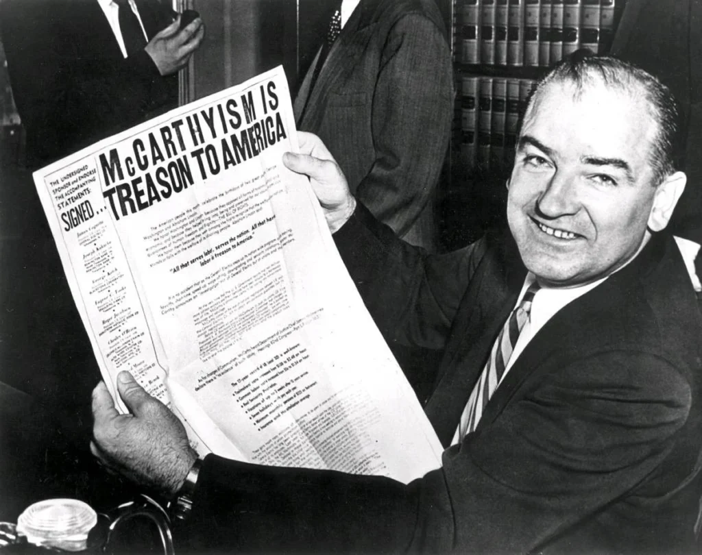 Reflecting on the Roosevelt Administration’s subservient position toward Russia, alongside the possibility of Hiss being a Soviet spy, Americans–including Joe McCarthy–wondered if there were more spies in their government. And so, McCarthy did his own investigation. In a 1950 speech, he announced, “I have here in my hand…a list of names that were made known to the Secretary of State as being members of the Communist Party and who nevertheless are still working for and shaping policy in the State Department.”