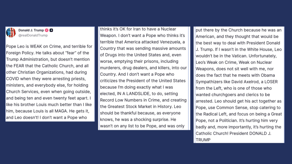 President Trump’s attack on Pope Leo yesterday, Sunday April 12, was disheartening and merits an apology. His subsequent post depicting himself as Jesus is as dangerous as it is scandalous to all Christians. The speed with which the picture was removed confirms the mistake that it was.